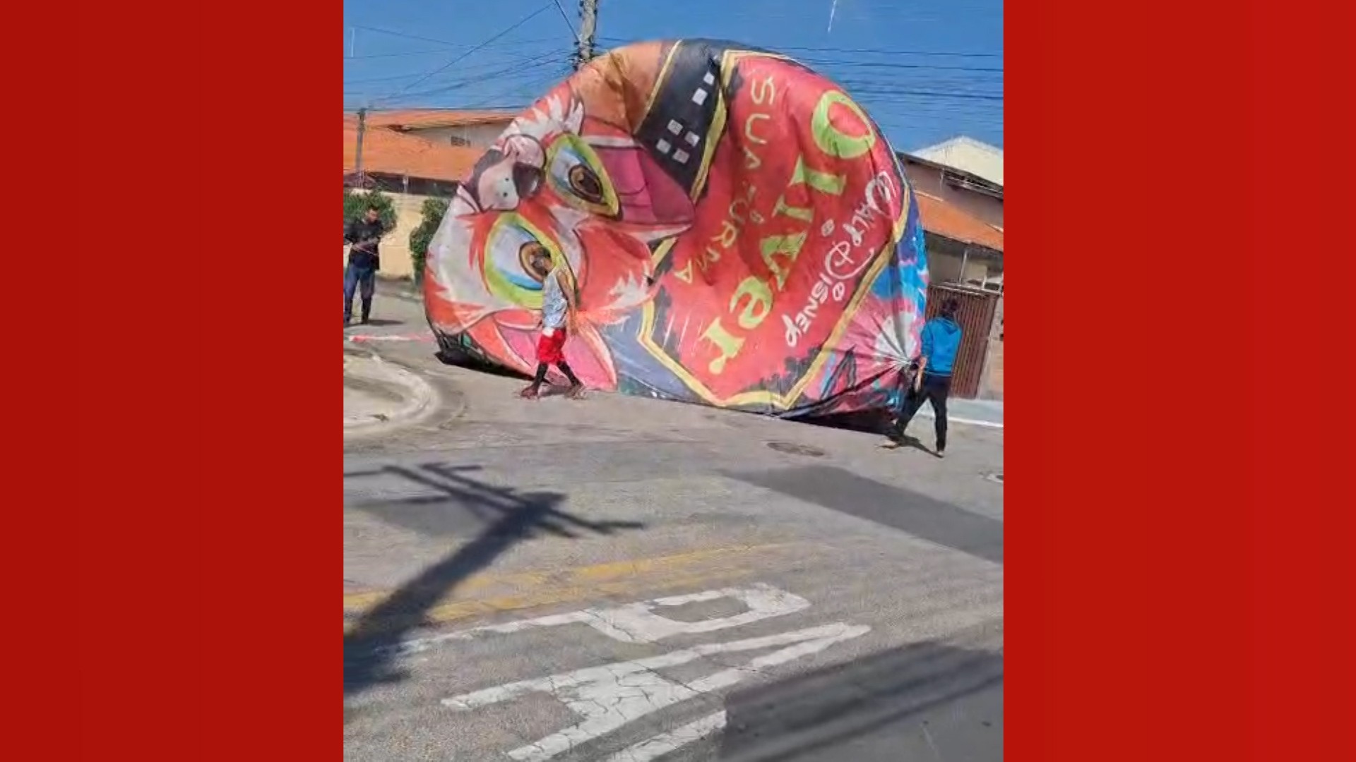A queda aconteceu por volta das 10h40, em uma residência que fica na rua Benedito Alexandre Trindade. O balão caiu no telhado, deixando pedaços da estrutura em cima da casa, da calçada do imóvel e também atingindo fios dos postes da rua.